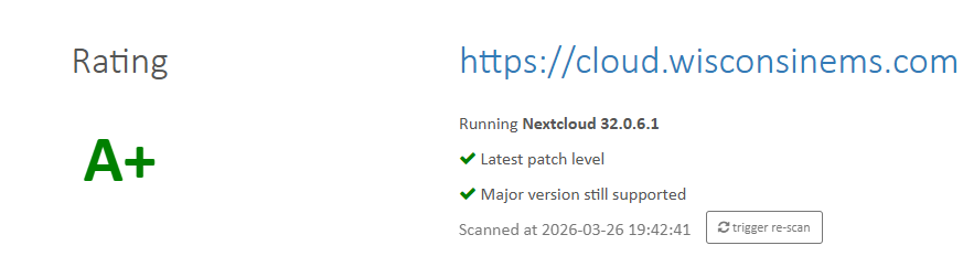 WEMSA Cloud maintains an A+ security rating with no known vulnerabilities and includes multiple hardening features designed to reduce attack risk and strengthen account protection.