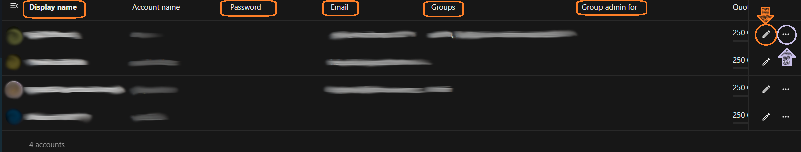 - Click the pencil/edit icon to update the user’s display name, password, email, groups, or Group Admin status.